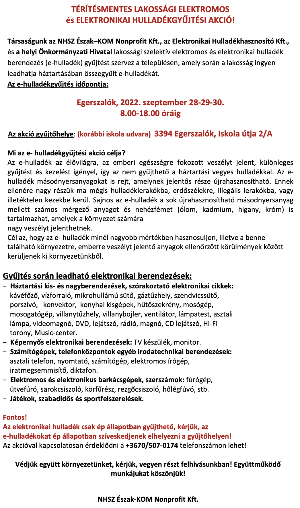 berendezés (e-hulladék) gyűjtést szervez a településen, amely során a lakosság ingyen